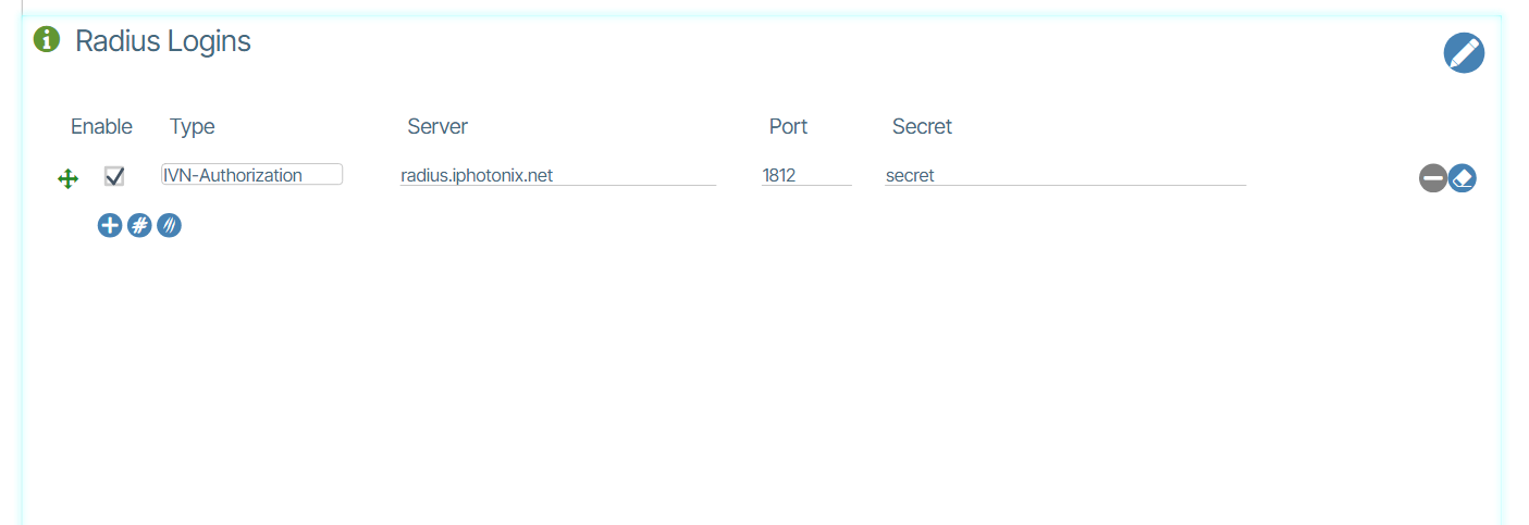 The Verity platform provides the option for RADIUS integration iVN-Authorization/Server IP/Port/Shared secret are required inputs. User permission level will be passed down according to the following levels: