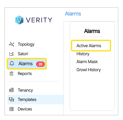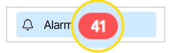 Active Alarms convey immediate problems occurring in the network right now. The Active Alarms window displays these alarms. A red background highlights the number of active alarms next to the Alarms Main Navigation tab.