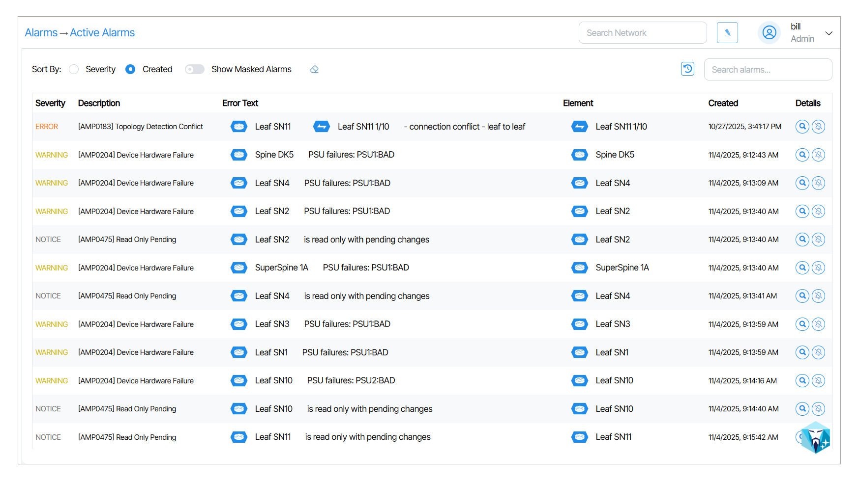 The Sort By feature is used to sort alarms. Alarms are sorted by Severity or by their creation time by enabling the Created option.