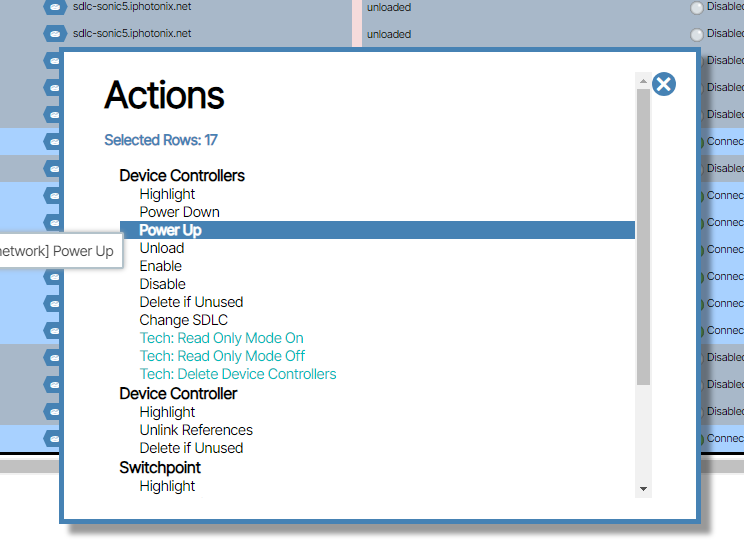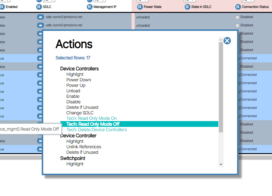 - Select the Actions button to turn Read only mode off and to Power Up the controllers.