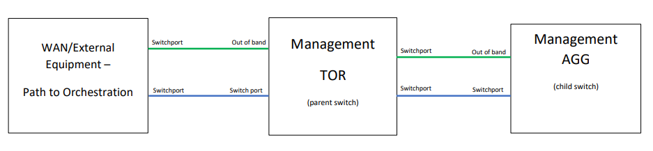 ZTP requires two connections simultaneously from the switch. One of the first 32 switch ports is designated to be the uplink connection to the WAN/Orchestration platform. The “out of band port” or “Management Port” of the switch is used to manage ONIE download and the ZTP process. Accommodations must be provided to allow the first switch (TOR) to go through the ZTP process. Once the TOR is up and running, connections for subsequent switches are made through the TOR. The management connections in the switching fabric are all untagged.