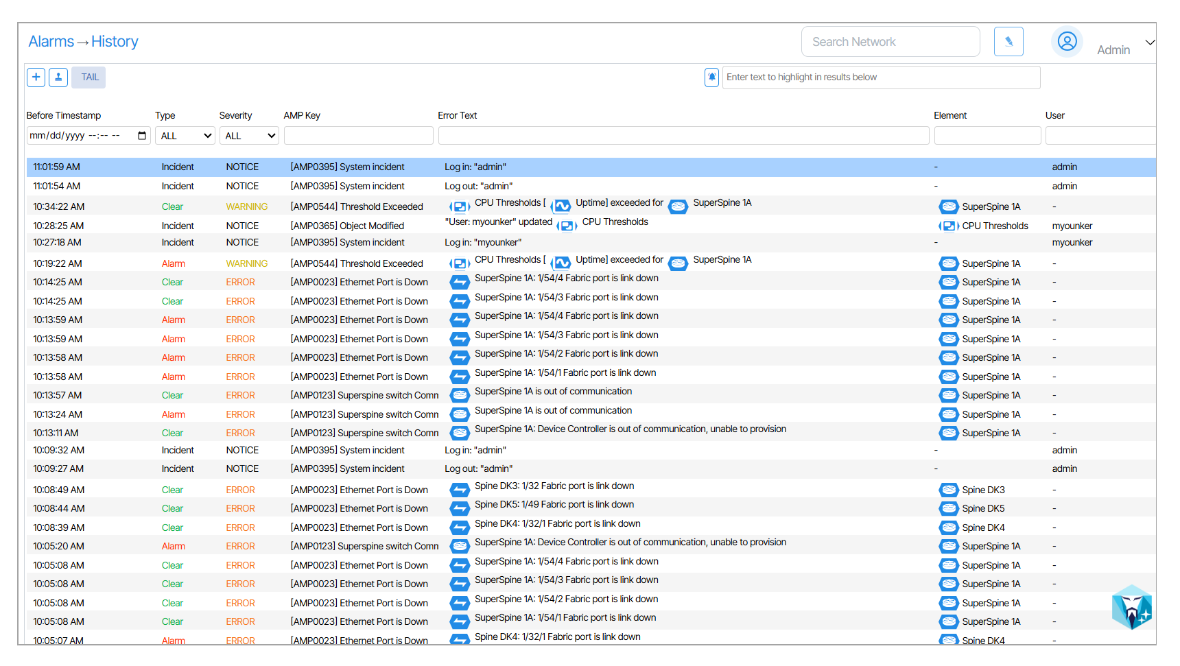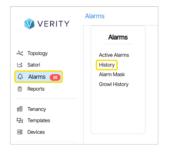 While Active Alarms notify administrators of immediate problems, History records previously resolved issues and tracks less pressing notifications such as user logins.