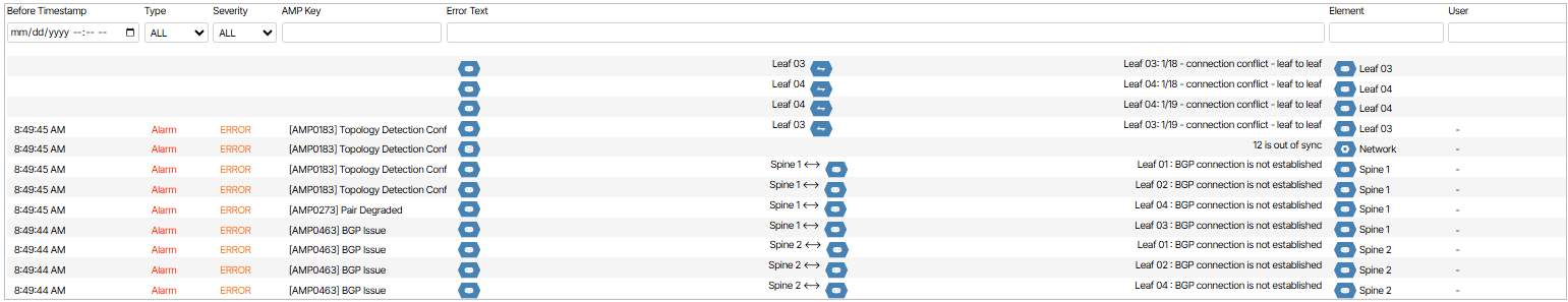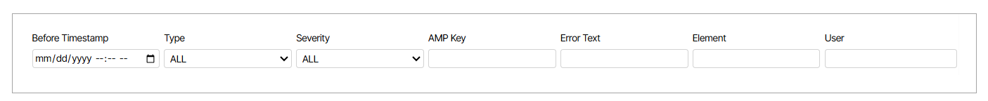 Each column features a form field positioned above it. These form fields enable the filtering of alarm data based on the content of the column. To use the filters, you choose a field(s), input a query, and press Enter on your keyboard to apply the filter. In addition to conventional search text, filters also accept Regex and glob patterns.