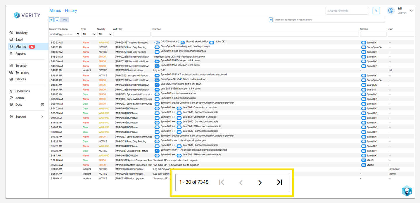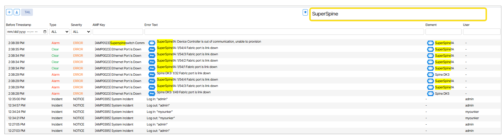 The search feature at the top of the page allows you to search for any text displayed in the current list of alarms. Any matching text is highlighted in yellow.