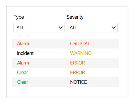 Severity filters alarms by their severity, such as Critical, Error, Warning, or Notice. Setting the value to All displays all items and disables the filter.