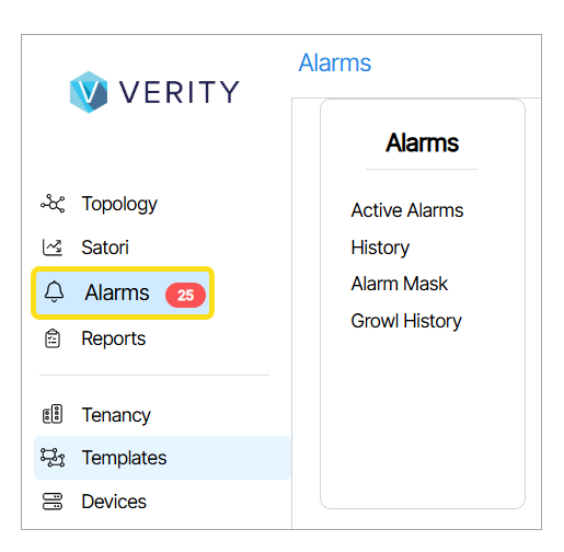 Alarms notify the administrator about problems within the system. The administrator accesses alarm information from the Alarms navigation panel.