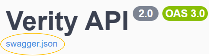 /swaggeron your Verity server IP. Example:https://vnc-datacenter.company.net/swagger - On this page, in the top left corner, is a link to the schema file if you wish to download it. To download a JSON copy of the API specification right-click on swagger.json and choose Save-As.