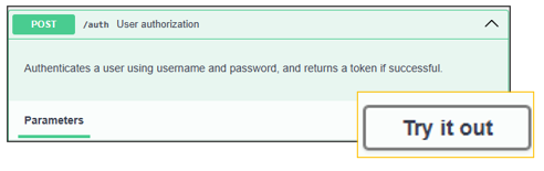- If successful, the action returns a 200 status code with a description of Successful authorization. The token is required for requests and expires in 30 minutes. The Authorization drop down menu does not need to remain open and can be closed.