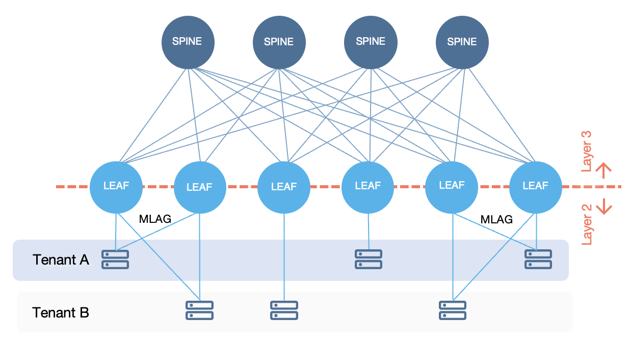 A collapsed core design has no spine layers, it is composed of a small number of leaf switches that are all interconnected with one another via MLAG peer connections or a simple Layer-2 trunk between switches. Since there is only one layer, both Layer-2 and Layer-3 functions run on the switches.