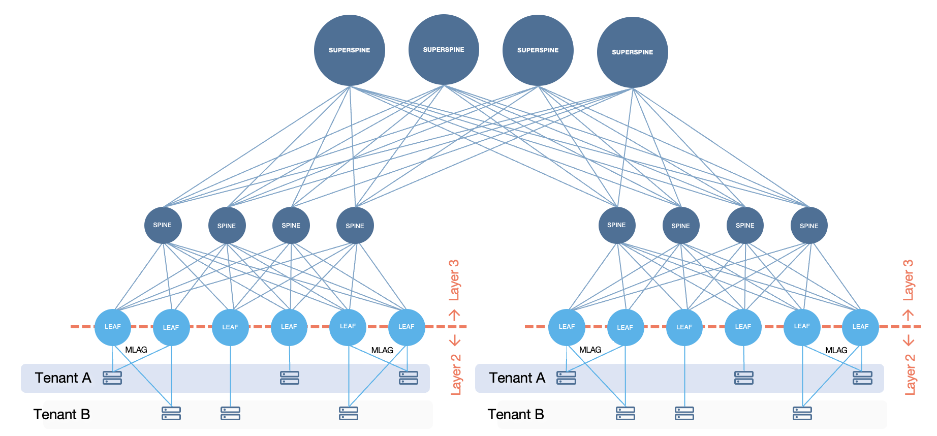 A 5 Stage Clos Fabric is identical to a 3 Stage, except that there are multiple groups of leafs and spines. Each group is commonly referred to as a Pod and multiple pods are connected through an additional layer of switches known as a Superspine. 5 Stage fabrics typically use BGP route reflectors or route servers to minimize the size of the routing table and simplify device configurations. Only build a 5 stage fabric if you know that your network will be of a size that requires it as the added complexity is typically unnecessary except in ther case of extremely large networks.