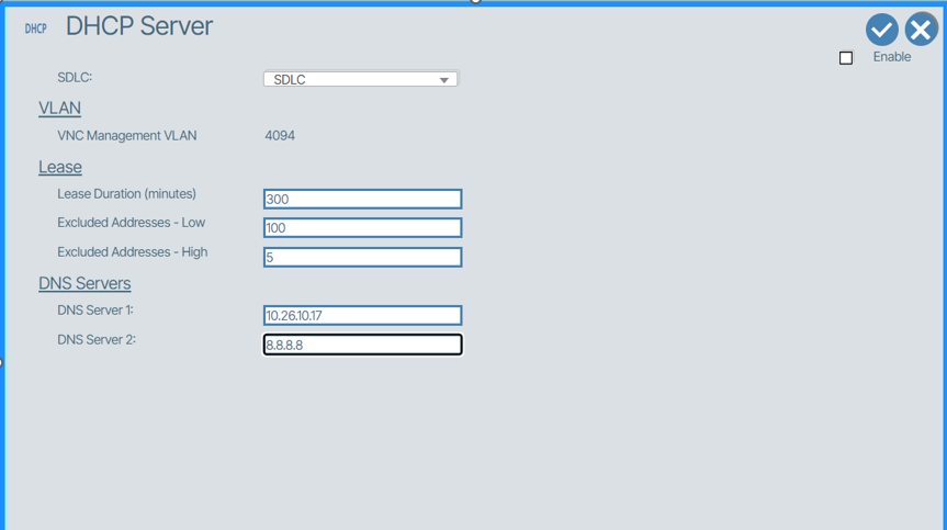 Check the box titled Enable and click the checkmark to save and start the internal DHCP service
