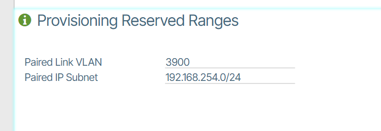 In the Admin page navigate to the “Provisioning Reserved Ranges” section and set up Paired Link VLAN and Paired Switch subnet (VLANs 3967-4094 are reserved in SONiC and should be avoided)