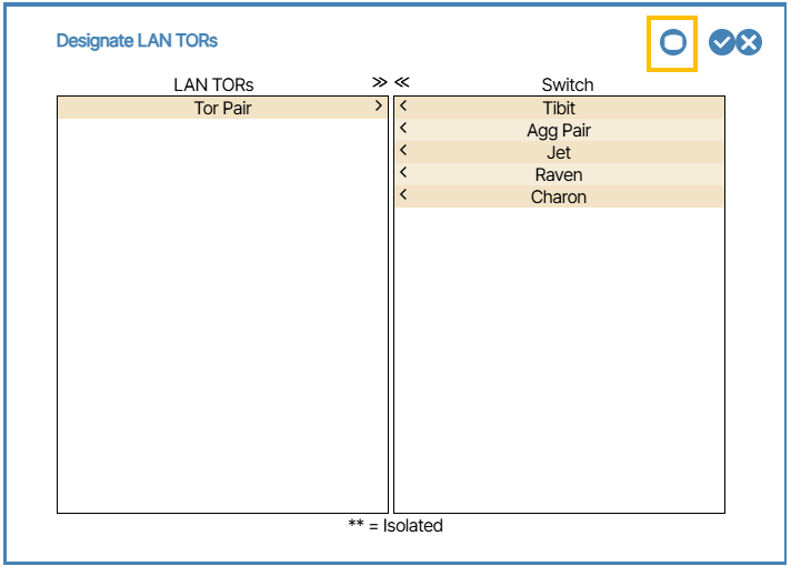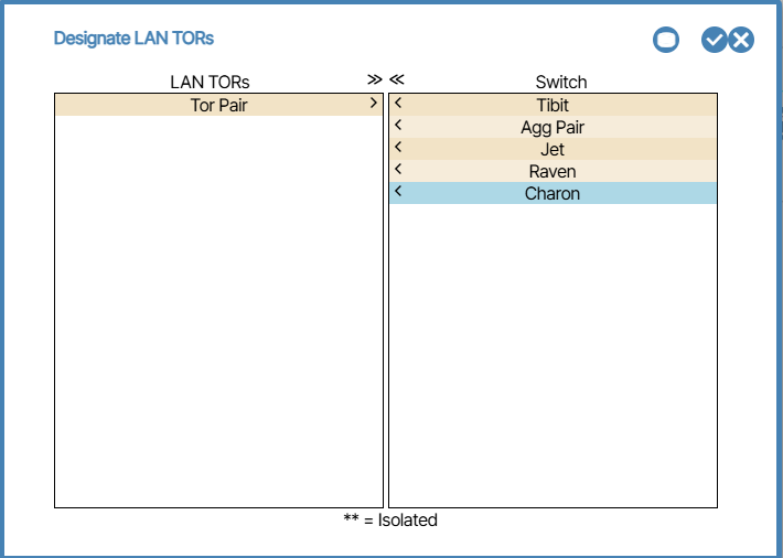 The Designate Lan TORS button opens a window that lets you identify your TOR devices. All items in the left column are identified as TOR devices and all items in right column are identified as Switch devices. Make your choices by clicking on the device(s) whose identification you want to change.