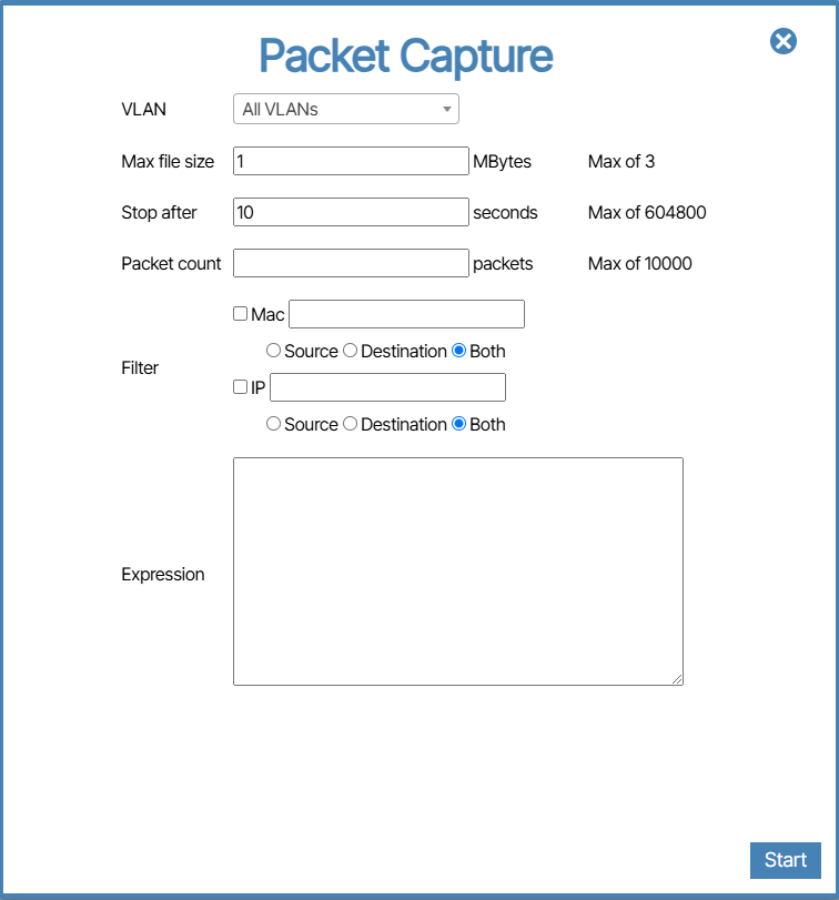 This field lets you capture packets of a select device based on its Mac Address. The settings Source, Destination and Either determine the packets to capture based on incoming or outgoing packets.