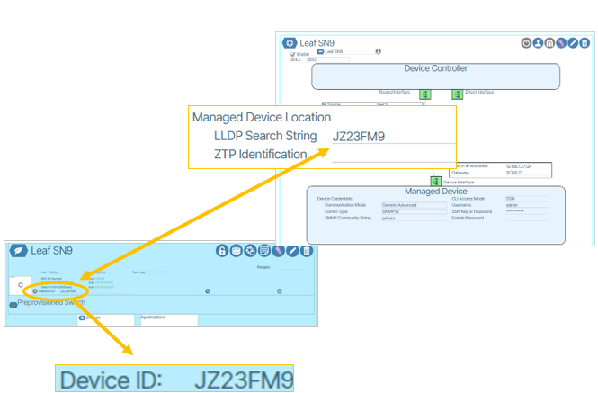 Each Device Controller includes both an LLDP Search String and a ZTP Identifier field. How these fields are populated determines how the hostname is assigned to the device. The hostname can be the set to the switchpoint name or to a hardware identifier (serial number or chassis ID).