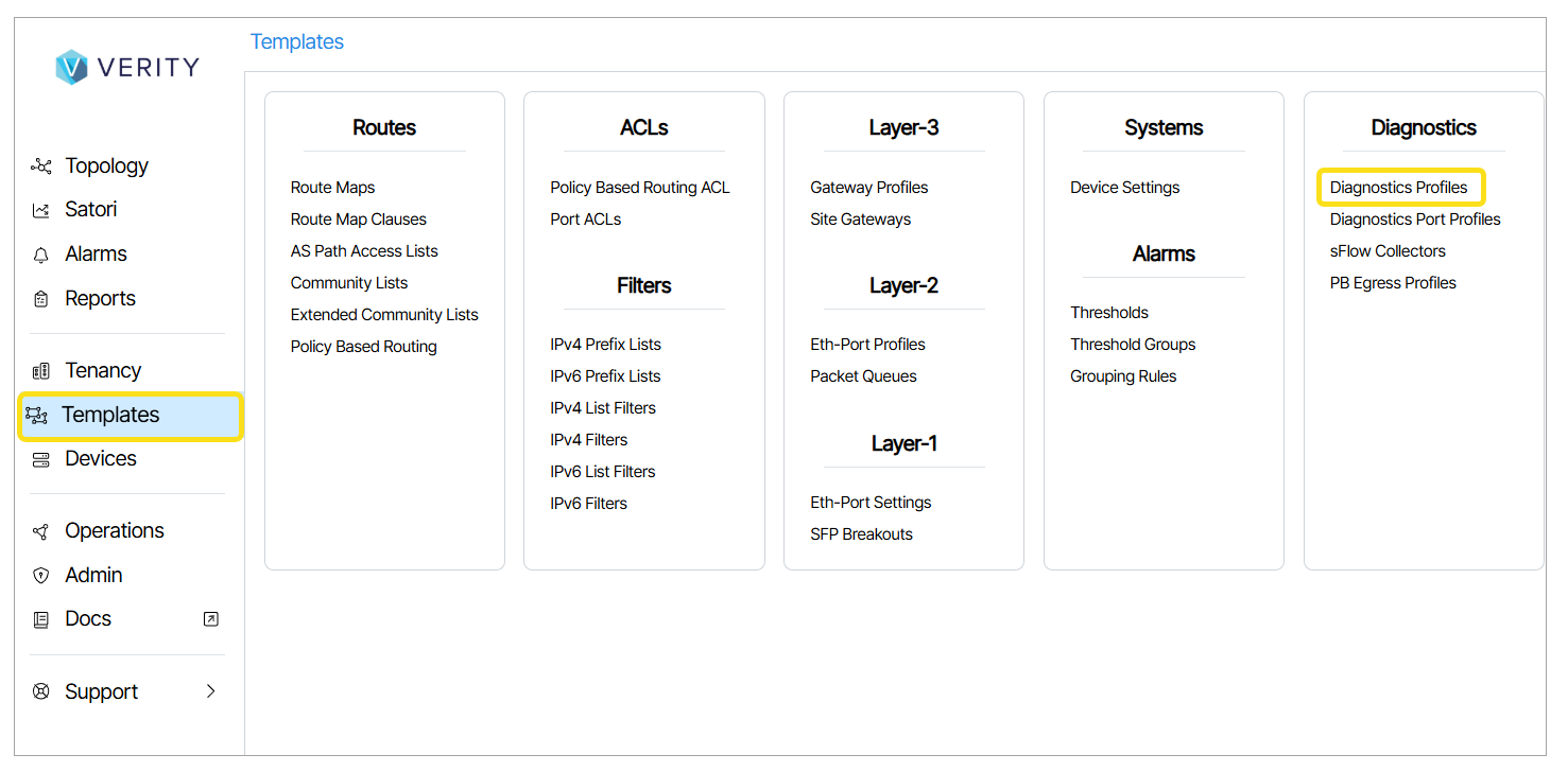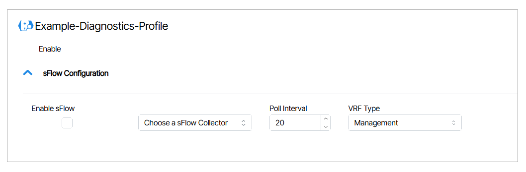 Diagnostics Profiles are device level templates that enable and configure sFlow monitoring on network switches, including settings for collectors, polling intervals, and VRF types.