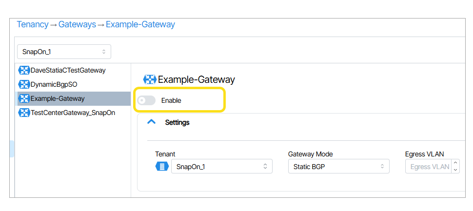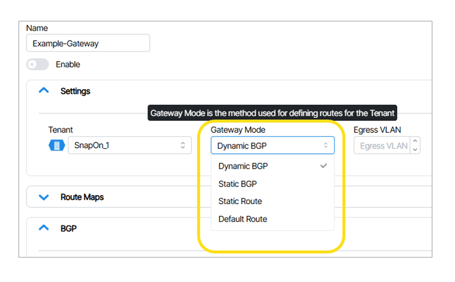 Gateways can be one of several different modes. The Gateway Mode field defines how the software handles and routes traffic within the network. It determines whether routing decisions are based on a statically defined default gateway, static routes, traditional BGP routing, or new enhancements to BGP to support dynamic neighbors (
