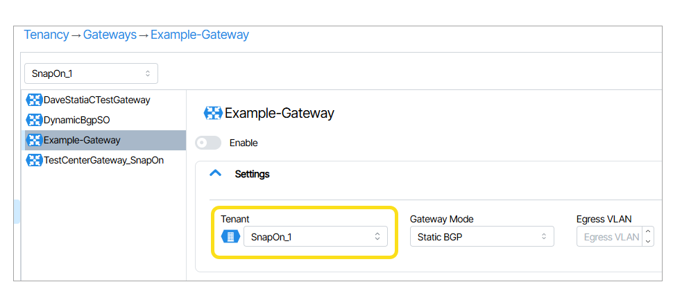 ). The Tenant field shows which tenant the Gateway is assigned to (
