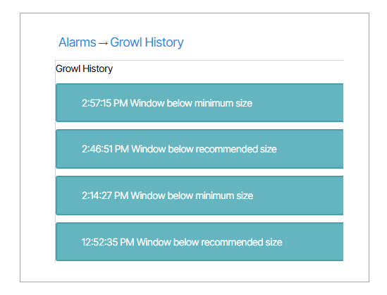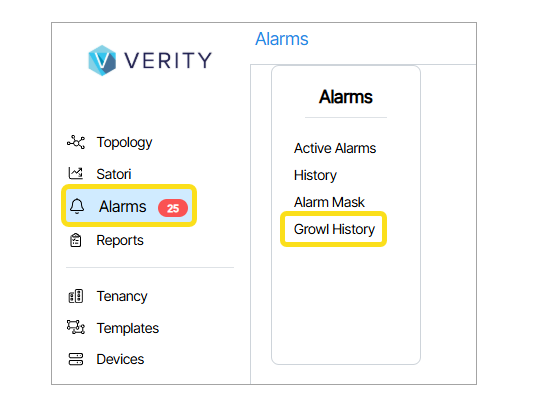 Growl History lists all system Growls. Growls are errors that occur between the client browser and the Verity orchestration platform. Hovering the mouse over a growl displays more detail about the error.