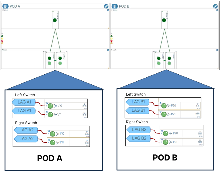 The image below shows a basic system containing two independent PODS with each containing a device pair. The PODS are devoid of a Super Spine connecting them. It is assumed that the requisite physical connections are made (an example would be a Leaf Pair in each POD, with each leaf connected by two wires, totaling four wires and involving eight ports).