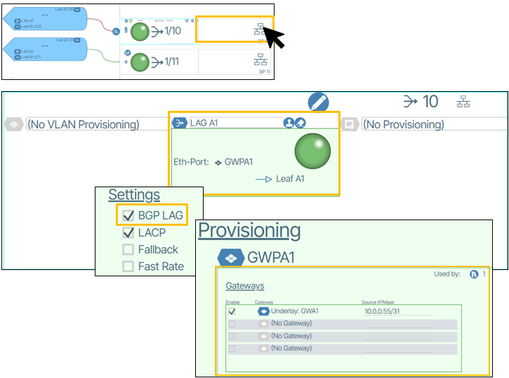 Adding a gateway profile to a LAG is needed to create the connection. You set the connection in the port editing window under the center form field. Here you enable the BGP LAG checkbox and chosen Gateway. The diagram below shows these settings for a single port.