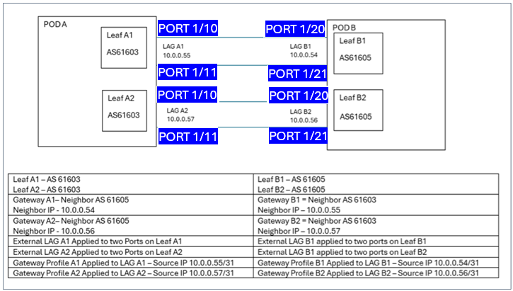 The chart below presents an example configuration that includes 2 PODS, 4 switches and 8 switch ports. Object names, IP addresses and Autonomous System numbers will differ for your configuration.