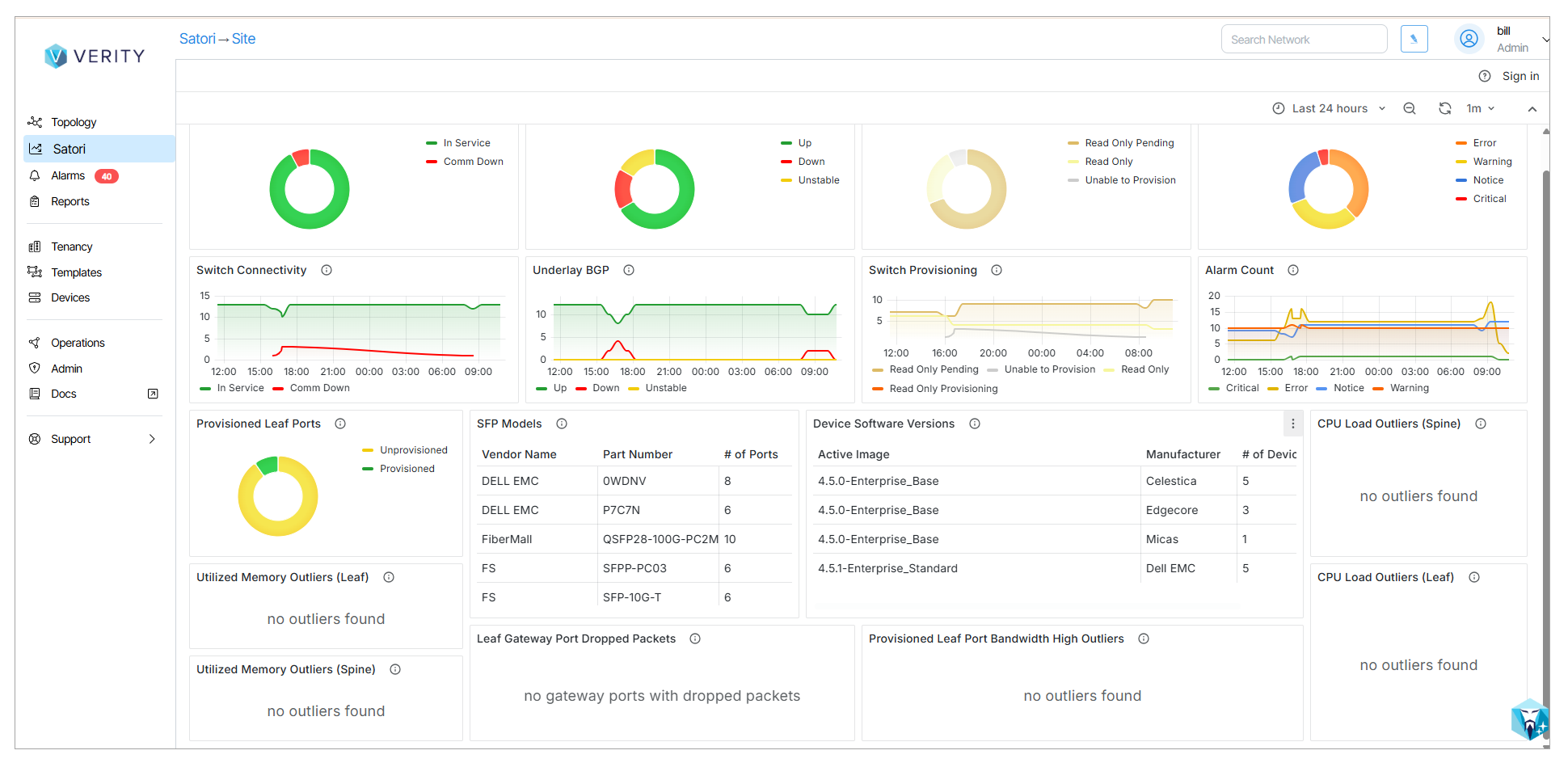 | Site | The Site dashboard presents high-level statistical information for all devices in the network, such as the percentage of in-service devices and general connectivity data. |