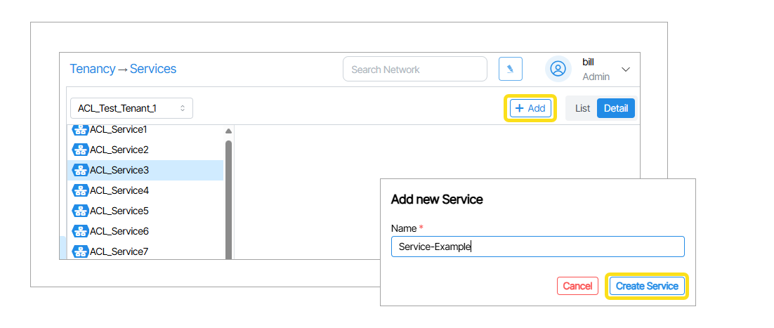 - From within the Services window (Tenancy -> Services) select the Tenant to assign the Service to.