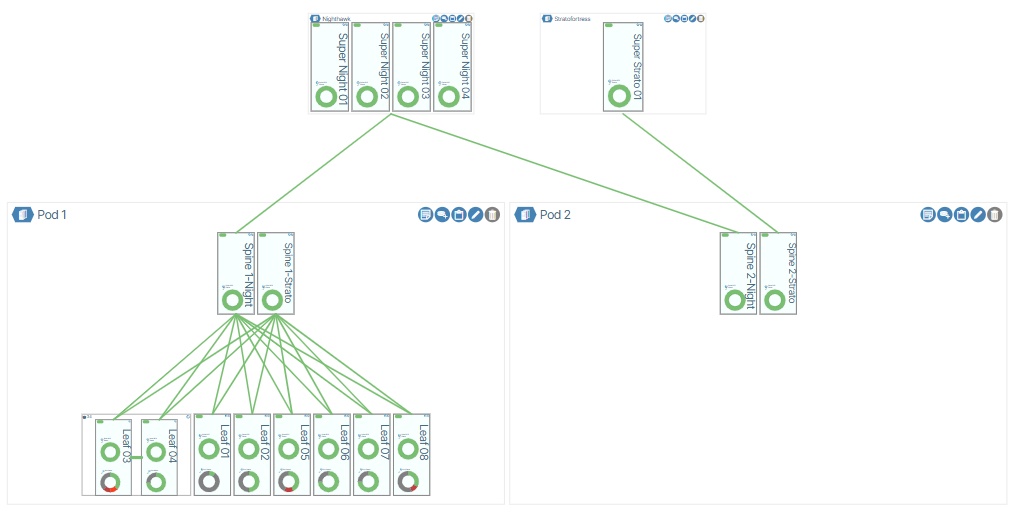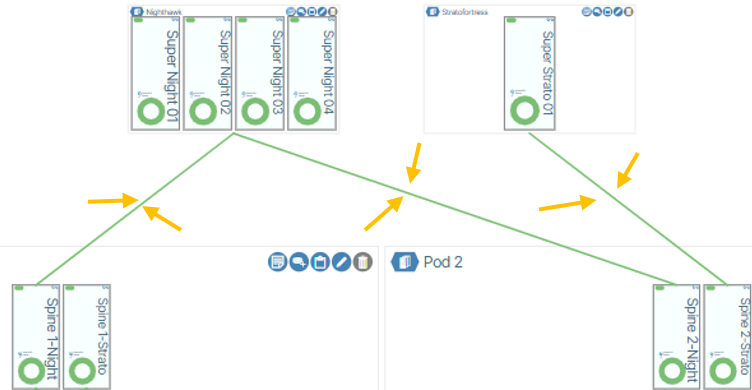 - When the configuration is complete, Verity will display virtual cables between the Spine Plane(s) and Spine(s) representing the relationship between the devices.