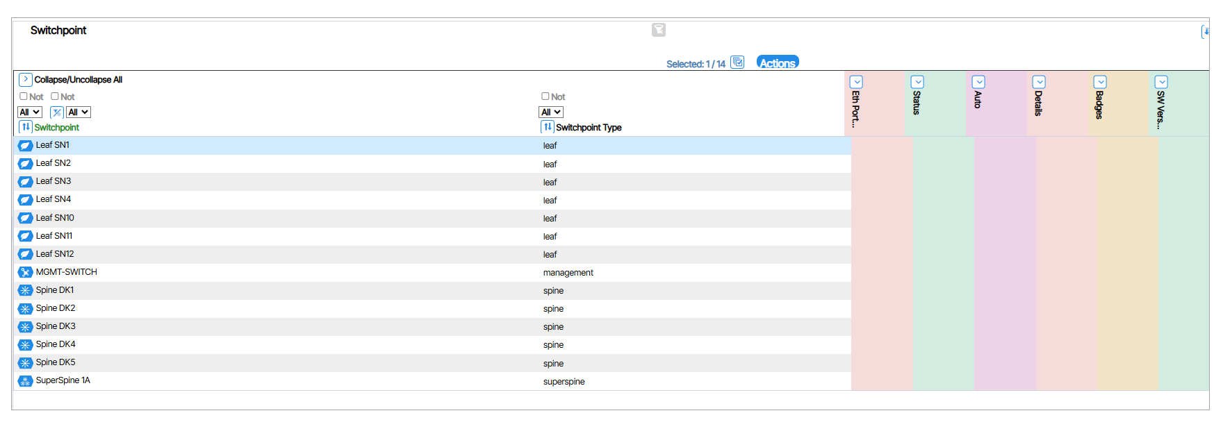 A Switchpoint represents a logical location for a device in the network and defines a connection pointโsuch as where leaf 1 connects to spine 3. By designing a network using Switchpoints, operators keep the logical design independent of specific devices, allowing them to insert a device into the switchpoint by referring to either its serial number or a chassis id.