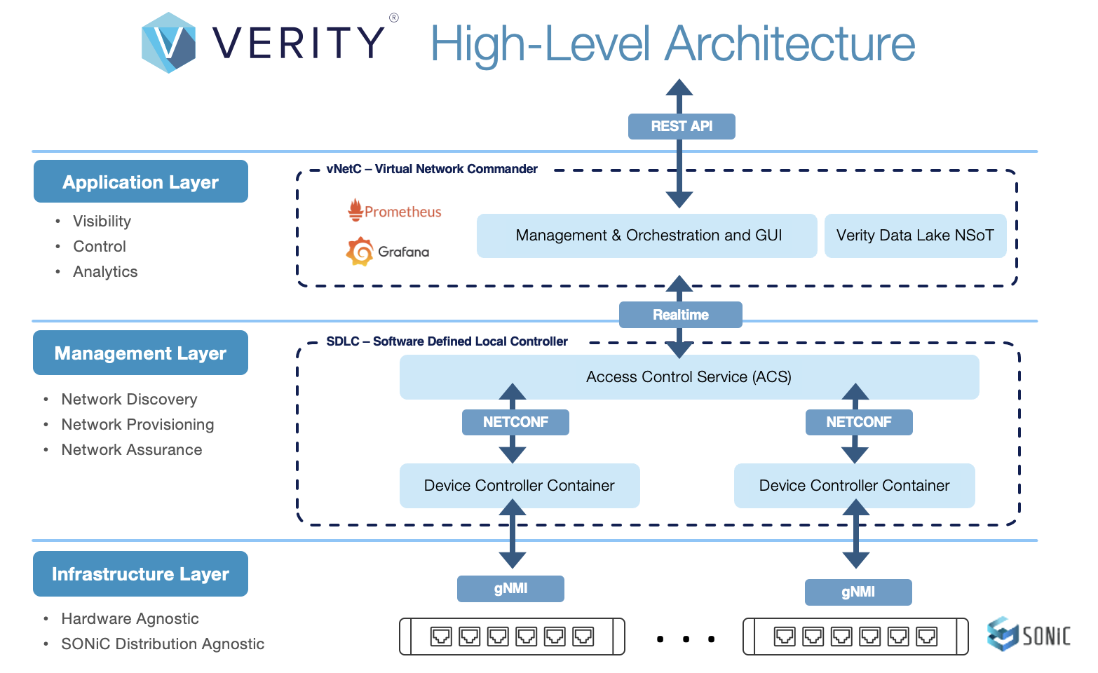 The backend L2 network that is managed by Verity. For Verity to function correctly, it needs to be able to access the managed devices via their management interface. Verity uses SSH, gNMI, SNMP and other protocols to manage devices in the OOB management network. During initial deployment, Verity can deploy and program the management network and automatically configure the attached switches, as well as inventory and detail how and where they are connected to the Management Switch(es).