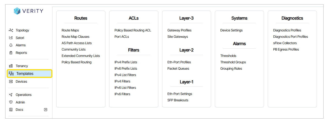 The Templates section is composed of tools used to configure and create reusable network device settings and policies. The reusable collections are called Template Objects. Templates and Template Objects are organized into functional categories based on network layers and operational domains.