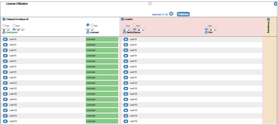 By clicking on the report icons for License Utilization, License by Device Utilization, and Physical Port Utilization, a report for those lists will be shown. For a specific report on used, preprovisioned, stranded, or spare licenses, the user can click on each section of the bar graph. This can also be done with physical ports that are licensed, fabric or spare.