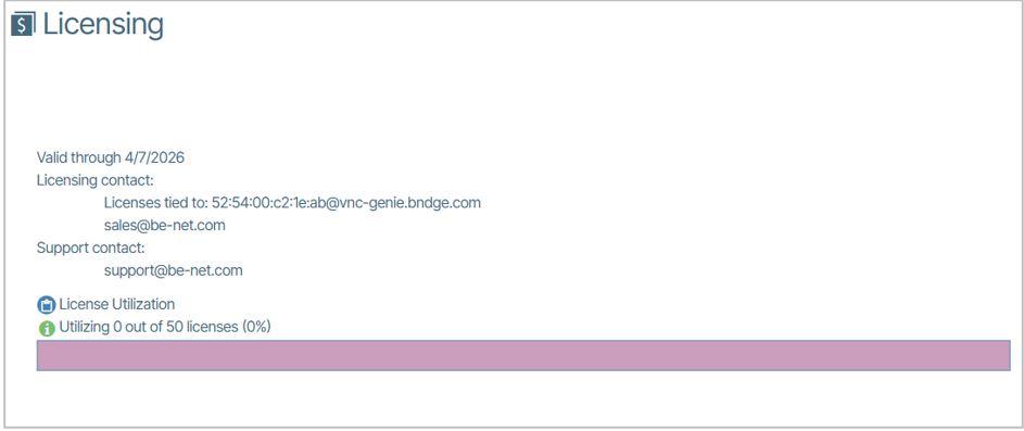 The Licensing object displays License Usage and Physical Port Usage bar graphs. While focused on the object, the user can see the date of licensing expiration, contact information for support, and reports of license.