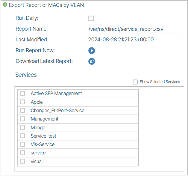 Mac Exports provides a summary MAC report for all devices connected to the network's user facing ethernet ports. This tool can be automated to generate a daily report or used on a case-by-case basis as needed. To manually run a report, enable the checkbox for all services you want to include, click Run Report Now, and wait for the Download Latest Report icon to turn blue. Once it does, click the icon to download the CSV file.