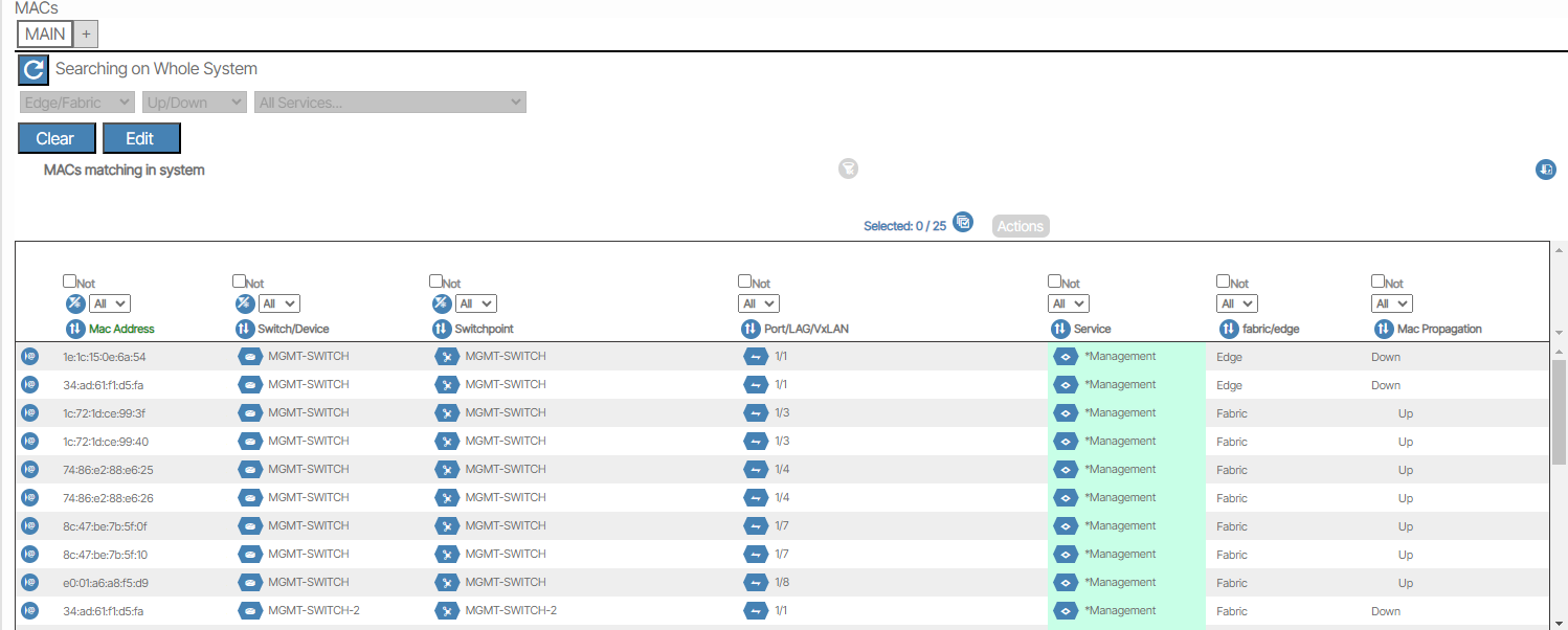 Verity provides the ability to display MAC addresses across the entire system. To use this feature navigate to Operations / MACs.