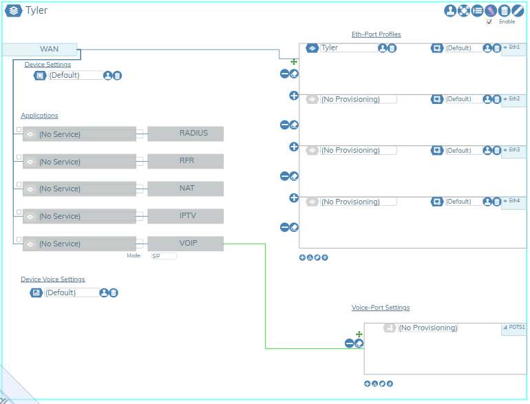The following figure shows the detail within a Bundle dialog box used to combine the device settings, Ethernet Port Profiles/Dynamic Policies, and Residential Applications. The number of Ethernet lines represented can be adjusted with the β+β and β-β icons, when not in edit mode. There are also buttons for removing, adding, and swapping multiple Eth-Ports.