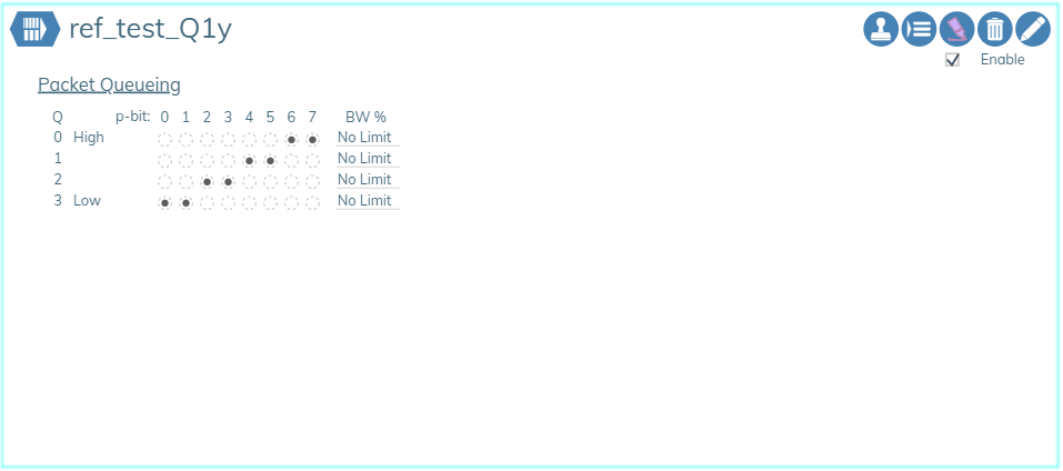 The window that appears lets you make your changes. Here you set the priority for p-bits and set the bandwidth (BW) for each queue as a percentage. The percentage is the maximum average percentage of the port output bandwidth that packets in that queue will be allowed to consume. The value cannot exceed 100 and a value of 0 means no limit is set.