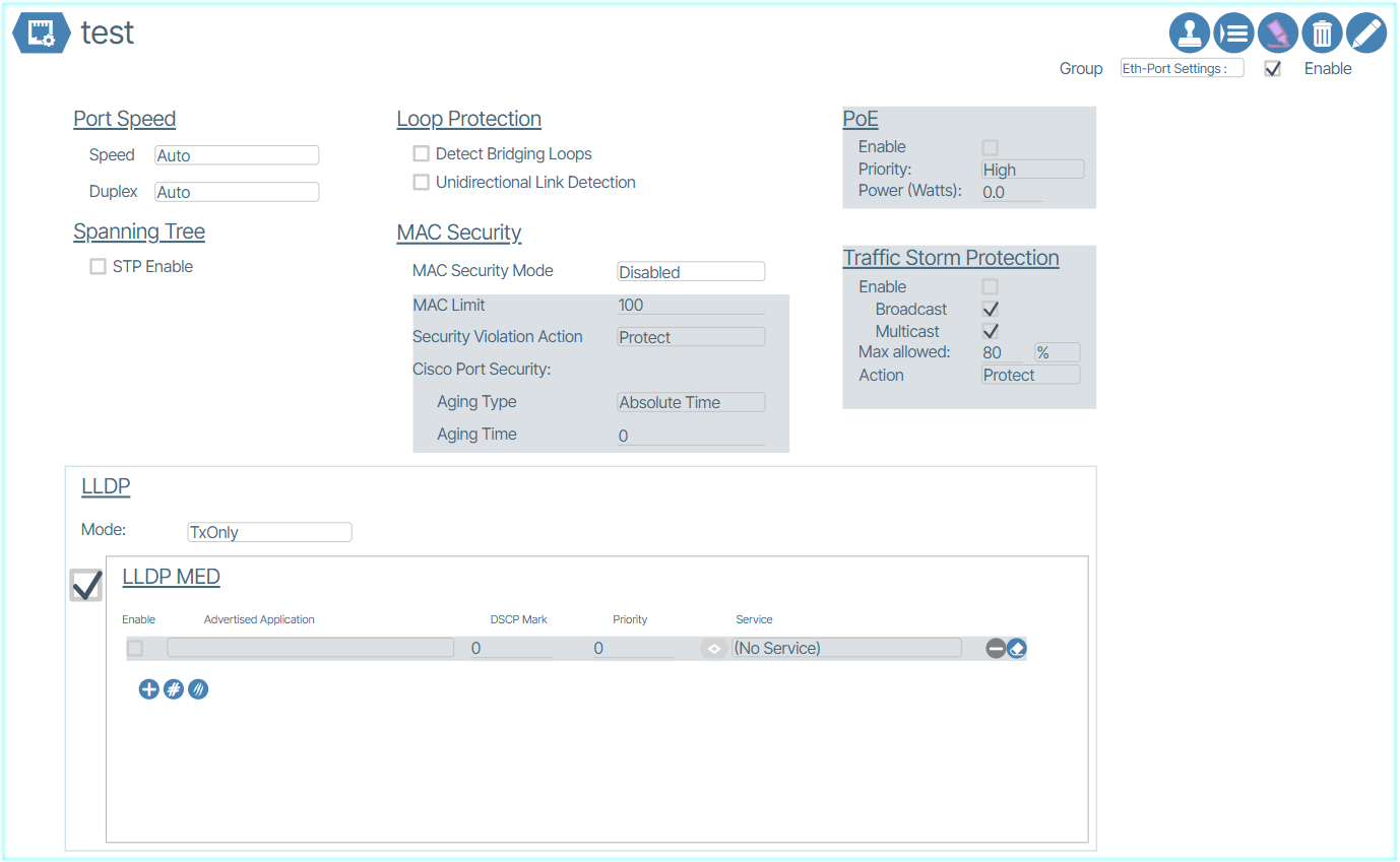 This window is used to set Ethernet Port speeds, per Port PoE settings and client device LLDP handling.