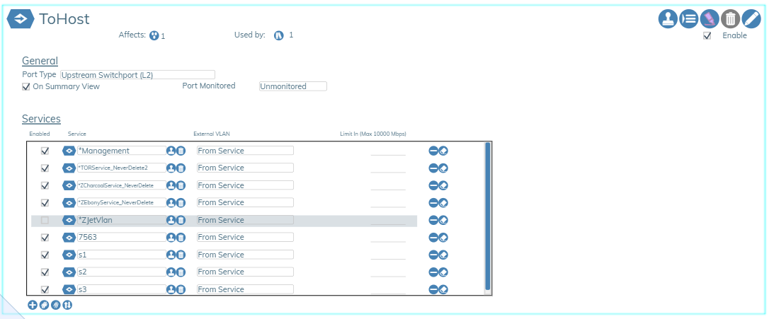 Service Port Profiles are normally assigned to links or LAGs connected to the TOR switch of the network. The user can edit the maximum downstream rate allowed on a per service basis. Other parameters such as spanning tree and port monitoring are set on the physical link.