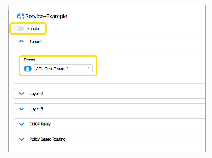 - The Service Enable switch defaults to off. The Tenant field shows which tenant the Service is assigned to