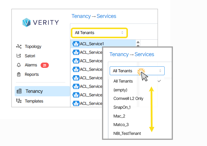 - From within the Services window (Tenancy -> Services) select the Tenant to assign the Service to.